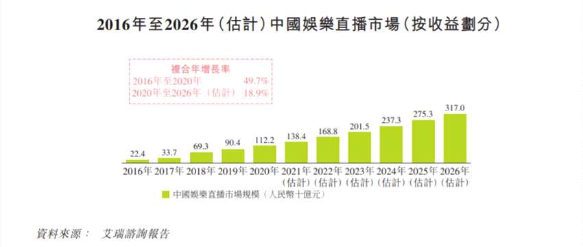 此外,中國(guó)視頻直播市場(chǎng)預(yù)期將以2020年至2026年間23.0%的復(fù)合年增長(zhǎng)率,于2026年達(dá)至人民幣5,910億。中國(guó)娛樂(lè)直播預(yù)計(jì)將由2020年的人民幣1,122億元增長(zhǎng)至2026年的人民幣3,170億元,2020年至2026年的復(fù)合年增長(zhǎng)率為18.9%。
