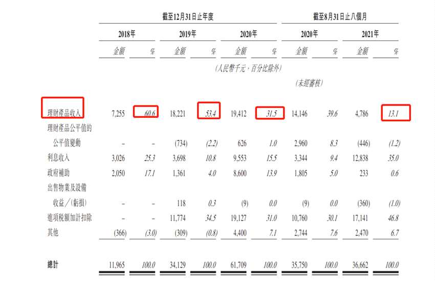 其他收入方面,2018年-2021年首8個(gè)月,理財(cái)產(chǎn)品投資收入占比分別為60.6%、53.4%、31.5%、13.1%。