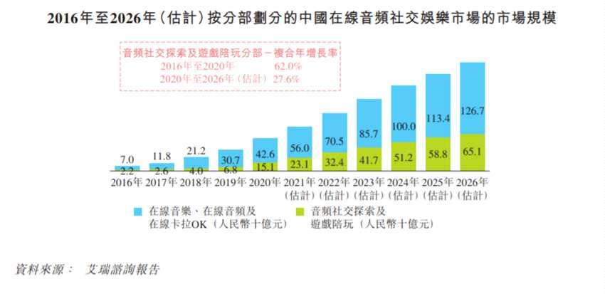 而中國(guó)在線音視頻社交娛樂(lè)市場(chǎng)則由2016年的人民幣370億元增加至2020年的人民幣3,638億元,復(fù)合年增長(zhǎng)率為77.1%,并預(yù)期以2020年至2026年間22.6%的復(fù)合年增長(zhǎng)率,于2026年達(dá)至人民幣12,350億元。