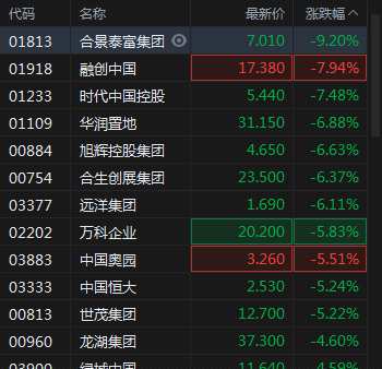 10月26日消息,內(nèi)房股跌幅擴(kuò)大,合景泰富跌超9%,融創(chuàng)中國(guó)跌近8%,時(shí)代中國(guó)控股跌超7%,華潤(rùn)置地跌6.88%,旭輝控股跌6.63%,中國(guó)恒大跌5.24%。