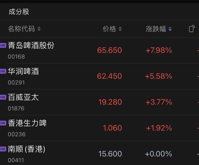 今日啤酒飲料板塊逆勢上漲,漲6.26%。其中青島啤酒股份(0168.HK)和華潤啤酒(0291.HK)領(lǐng)漲,分別為7.98%和5.58%。