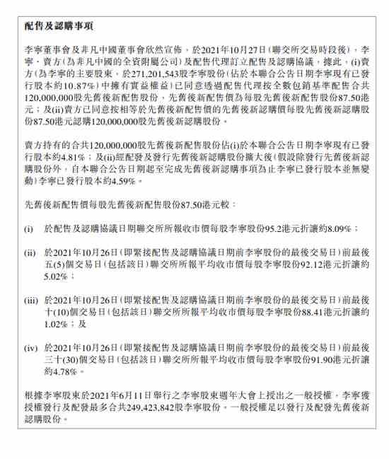 先舊后新配售價每股先舊后新配售股份87.50港元較配售及認(rèn)購協(xié)議日期聯(lián)交所所報收市價每股李寧股份95.2港元折讓約8.09%。