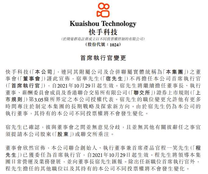 摘要: 10月29日,快手科技在港交所發(fā)布公告稱,董事會(huì)已同意公司聯(lián)合創(chuàng)始人宿華辭去首席執(zhí)行官一職,并已批準(zhǔn)聯(lián)合創(chuàng)始人程一笑擔(dān)任該職務(wù),自2021年10月29日起生效。公告顯示,