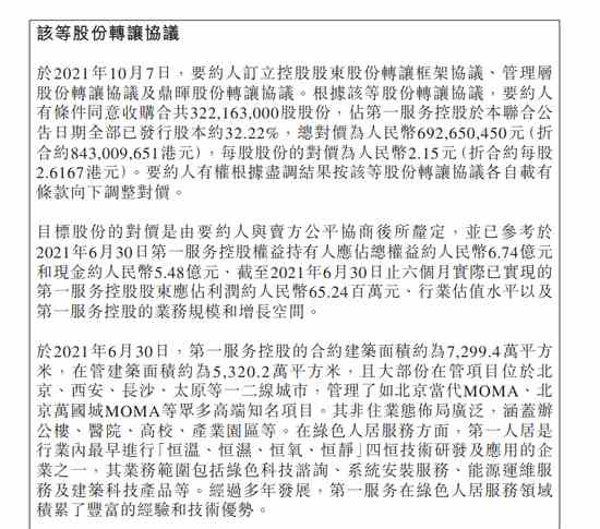 11月1日消息,融創(chuàng)服務和第一服務控股分別公告,融創(chuàng)服務以6.92億元收購第一服務總計約3.22億股股份,收購價格為2.15元/股,收購的股份占第一服務已發(fā)行股本的32.22%。