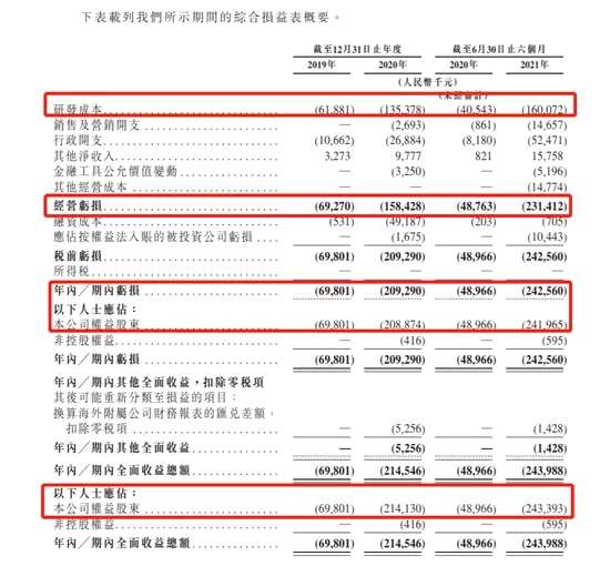 根據(jù)財(cái)報(bào),公司在2019年、2020年及2020年上半年及2021年上半年,分別錄得虧損凈額人民幣6980.1萬(wàn)元、2.09億元、4896.6萬(wàn)元及2.43億元,主要由于公司的研發(fā)成本及行政開(kāi)支所致。