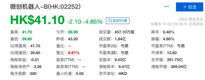 11月2日,微創(chuàng)機器人(300024,股吧)在港交所掛牌上市,發(fā)行價43.2港元,上市首日遭遇破發(fā),開盤價為39.8港元,低開7.87%。
