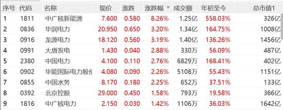 電力股集體走高:中廣核新能源漲超8% 華潤電力漲超3%