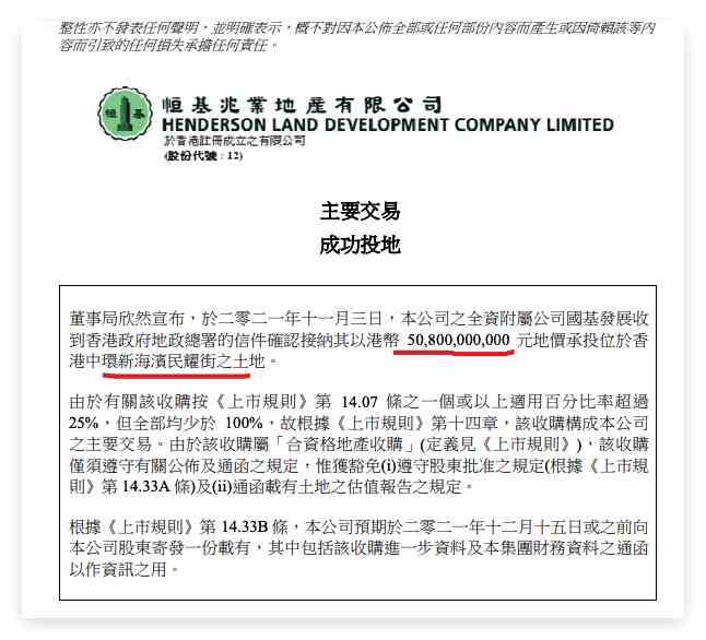 據(jù)悉,恒基地產(chǎn)發(fā)布公告,11月3日,公司全資附屬公司國基發(fā)展收到香港政府地政總署的信件確認(rèn)接納其以港幣508億元地價承投位于香港中環(huán)新海濱民耀街的土地,土地面積約47,967平方米,土地使用年限為50年。
