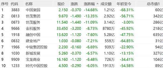 內(nèi)房股集體走跌:中國奧園跌近15%,世茂集團跌超13%