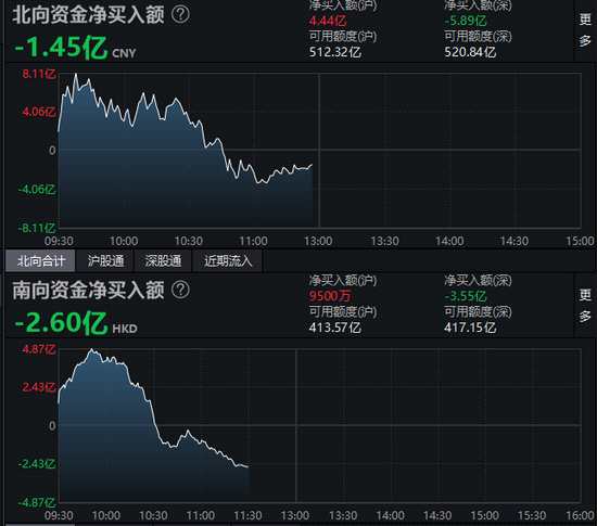 11月8日消息,截至滬深股市午間收盤,北向資金凈賣出1.45億元,滬股通凈買入4.44億元,深股通凈賣出5.89億元。