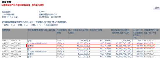 據(jù)港交所披露易,11月3日,楊惠妍增持碧桂園1000萬股,涉資7349.1萬港元,持股增至60.88%。