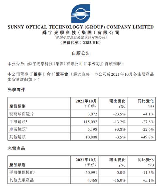 舜宇光學(xué)科技:10月手機(jī)攝像模組出貨量為1.151億件 同比下降27.8%