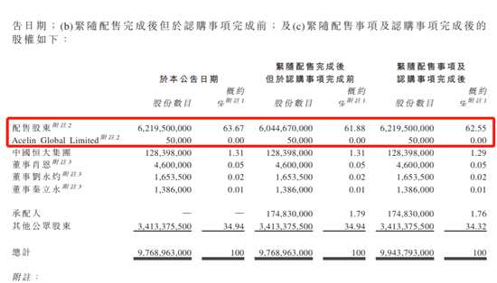配售完成后,中國恒大持股從63.67%稀釋為62.55%。