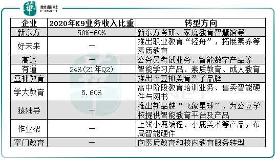 好未來和學(xué)大教育也披露了K9業(yè)務(wù)的收入比重,上述期間內(nèi)收入比重分別為24%及5.6%,該比重雖然沒有新東方高,但為了維持業(yè)務(wù)運(yùn)營,這兩家公司也轉(zhuǎn)型至其他領(lǐng)域。