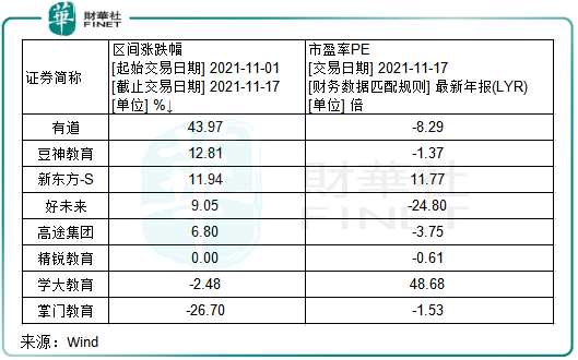 網(wǎng)易有道在區(qū)間內(nèi)累計(jì)漲幅超過40%,榮獲漲幅榜桂冠。豆神教育和新東方累計(jì)漲幅均超過10%,好未來也收獲了9.05%的漲幅。