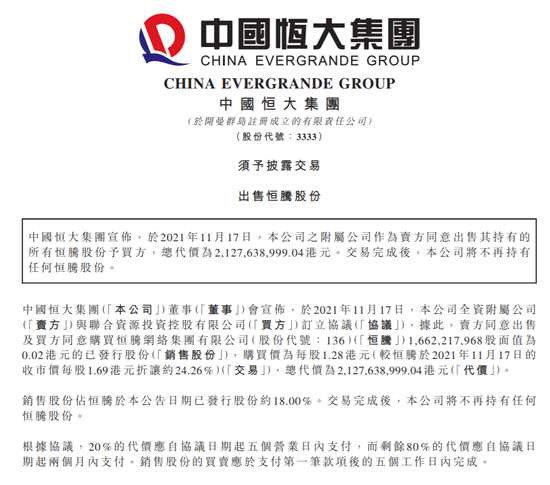 中國(guó)恒大發(fā)布公告,公司出售16.62億股恒騰網(wǎng)絡(luò)股份,出售價(jià)為每股1.28港元,較11月17日收盤價(jià)折讓約24.26%,總代價(jià)約21.3億港元,出售完成后,恒大不再持有任何恒騰網(wǎng)絡(luò)股份。