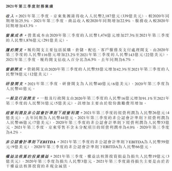 11月18日消息,京東:2021年第三季度營(yíng)收2187億元,同比增25.5%;第三季度凈虧損28億元,上年同期盈利76億元。
