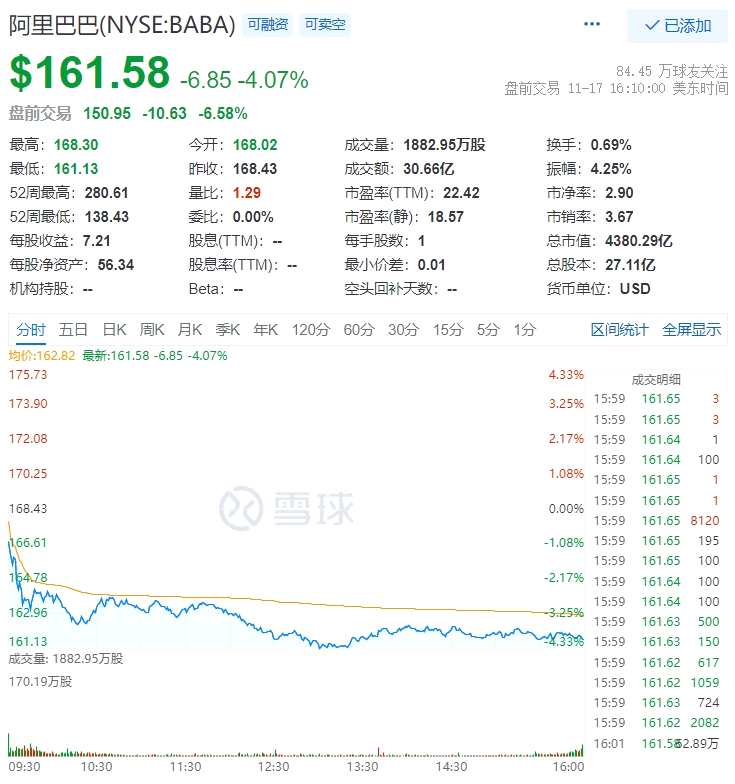 截至發(fā)稿時(shí),阿里美股盤前股價(jià)已下跌6.5%,市值約為4096萬億美元(人民幣約2.6億元)。