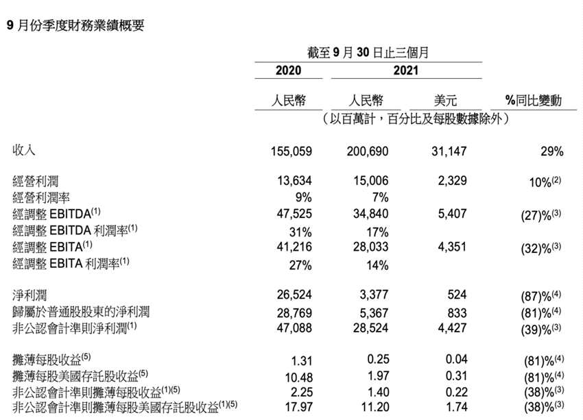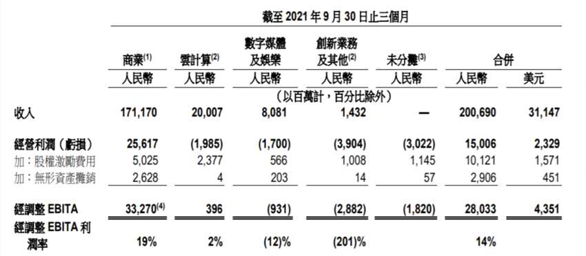 財(cái)報(bào)提到,截至2021年9月30日的三個(gè)月內(nèi),阿里巴巴核心商業(yè)收入1711.7億元,同比增長31%,經(jīng)營利潤256億元,同比下滑34%,經(jīng)調(diào)整后凈利潤332.7億元,同比下降27%。