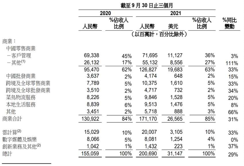 除此之外,中國批發(fā)商業(yè)、跨境及全球零售、批發(fā)、菜鳥物流、本地生活等商業(yè)收入的增幅均在2%-5%之間,相對穩(wěn)定。