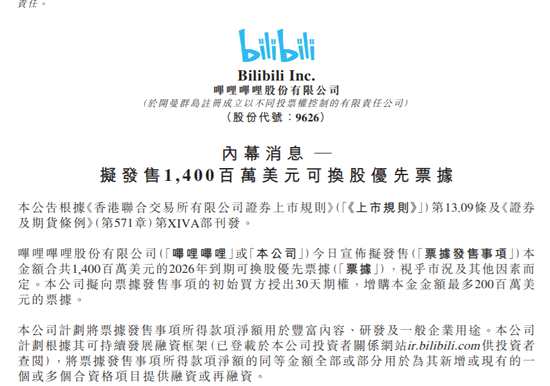 摘要: 嗶哩嗶哩在美股股價大跌逾10%,一度跌超16%。18日晚間公司發(fā)布公告,公司宣布擬發(fā)售(「票據(jù)發(fā)售事項」)本金額合共1,400百萬美元的2026年到期可換股優(yōu)先票據(jù)(「票據(jù)」),