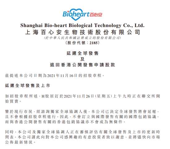 百心安-B11月22日在港交所發(fā)布公告稱,鑒于現(xiàn)行市況,經(jīng)咨詢獨家全球協(xié)調(diào)人后,本公司已決定全球發(fā)售將會延遲,且不會根據(jù)招股章程進行。因此,不會訂立與國際發(fā)售有關(guān)的國際包銷協(xié)議,而與香港公開發(fā)售有關(guān)的香港包銷協(xié)議亦不會成為無條件。