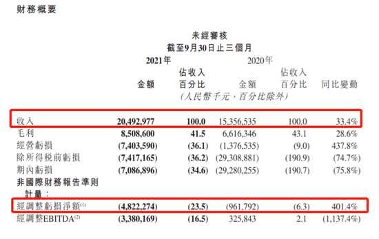 快手第三季度營收205億元,去年同期為153.57億元,同比增加33.4%;公司調(diào)整后凈虧損為48.22億元,同比擴大401.4%。