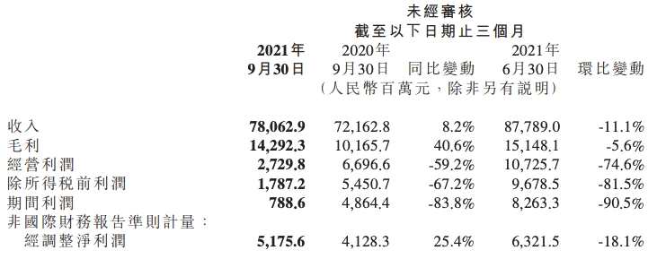 2020年第三季度及2021年第三季度,小米集團(tuán)分別取得利潤人民幣49億元及利潤人民幣8億元。經(jīng)調(diào)整凈利潤由2020年第三季度的人民幣41億元增加25.4%至2021年第三季度的人民幣52億元。