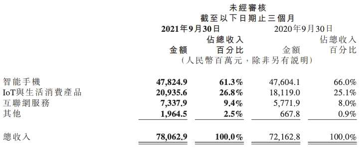 IoT與生活消費(fèi)產(chǎn)品分部毛利率由2020年第三季度的14.2%降至2021年第三季度的11.6%,主要是由于產(chǎn)品組合及若干核心零部件價(jià)格上升所致。