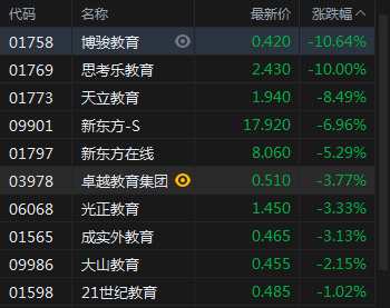 11月26日消息,教育股集體下跌,博駿教育跌近11%,思考樂教育跌10%,天立教育跌超8%,新東方跌近7%,新東方在線跌超5%。