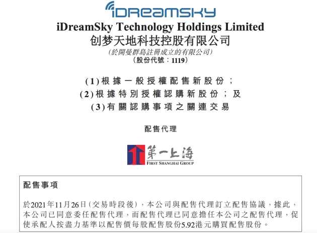 創(chuàng)夢(mèng)天地表示,11月26日,公司與配售代理訂立配售協(xié)議,據(jù)此,配售代理已同意擔(dān)任公司的配售代理,促使承配人按盡力基準(zhǔn)以配售價(jià)每股配售股份5.92港元購(gòu)買最多7228萬(wàn)股新股份。配售事項(xiàng)的估計(jì)所得款項(xiàng)凈額預(yù)期約為4.27億港元。