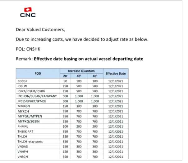 據(jù)媒體報道,11月東南亞地區(qū)運(yùn)費(fèi)再度大幅上漲,這或許與疫情反復(fù)有關(guān),根據(jù)全球第三大海運(yùn)公司達(dá)飛航運(yùn)近期報價,該公司蛇口港至泰國曼谷、林查班港,漲價USD350/700/700;蛇口至仁川釜山等主要港口,漲價USD500/1000/1000。