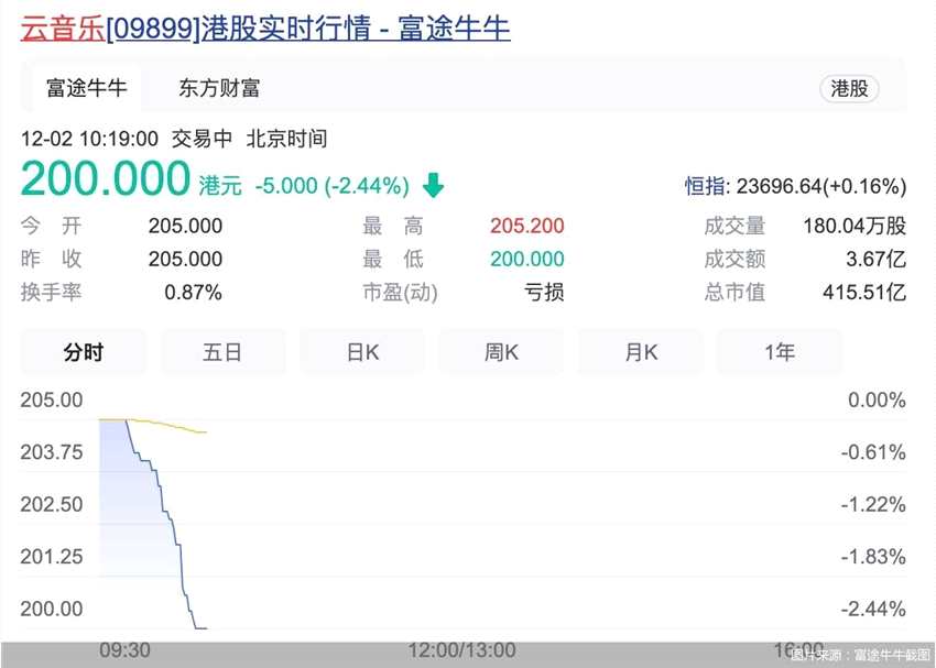 但開(kāi)盤后,網(wǎng)易云音樂(lè)股價(jià)不算爭(zhēng)氣,截至北京商報(bào)記者發(fā)稿,跌至200港元,較開(kāi)盤價(jià)205港元下跌2.44%。