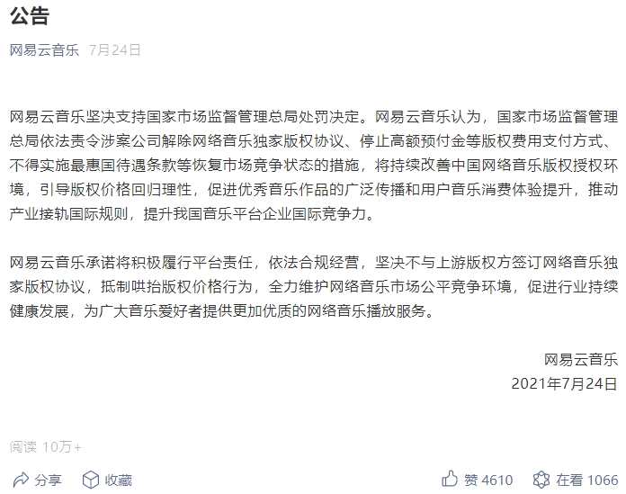 騰訊對(duì)此發(fā)布回應(yīng)稱,“認(rèn)真遵守決定,不折不扣完成整改”;而網(wǎng)易云音樂(lè)的公告則表示,“堅(jiān)決支持國(guó)家市場(chǎng)監(jiān)督管理總局處罰決定”。
