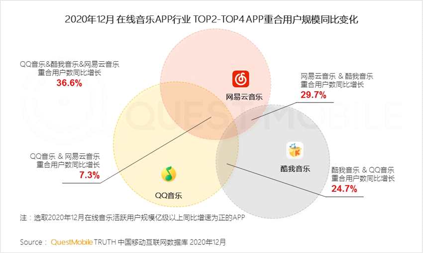 艾媒咨詢數(shù)據(jù)顯示,中國(guó)數(shù)字音樂(lè)市場(chǎng)規(guī)模保持穩(wěn)定增長(zhǎng)態(tài)勢(shì),預(yù)計(jì)2021年市場(chǎng)規(guī)模將增長(zhǎng)至428.9億元。但另?yè)?jù)QuestMobile數(shù)據(jù),2020年12月,QQ音樂(lè)、酷我音樂(lè)、網(wǎng)易云音樂(lè)重合用戶同比增長(zhǎng)36.6%。