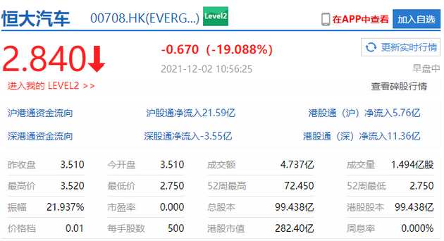 摘要: 查看最新行情新浪科技訊12月2日上午消息,恒大汽車直線下挫,現(xiàn)跌超19%。此前中國恒大減持恒大汽車9億股股份,持股比例降至63.84%。