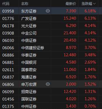 12月6日消息,中資券商股集體拉升,東方證券、廣發(fā)證券(000776,股吧)漲超6%,中金公司、中信證券(600030,股吧)漲超4%,中信建投證券漲3.7%,華泰證券(601688,股吧)漲3.48%。