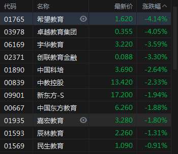 12月10日消息,教育股集體走低,希望教育、卓越教育跌超4%,宇華教育跌3.59%,中教控股跌2.33%,新東方跌1.94%。