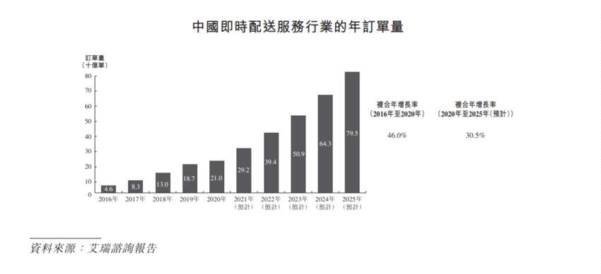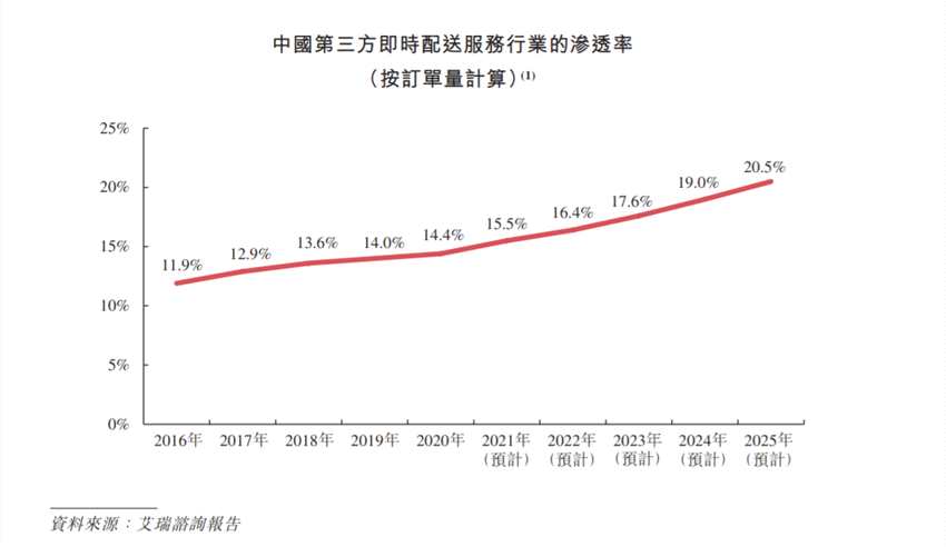根據(jù)艾瑞諮詢報告,于2020年,中國第三方即時配送服務(wù)行業(yè)的訂單數(shù)量占即時配送服務(wù)行業(yè)訂單總數(shù)量的14.4%,而2016年的占比則為11.9%。預(yù)計于2025年,中國第三方即時配送服務(wù)行業(yè)的訂單數(shù)將占即時配送服務(wù)行業(yè)的20.5%。