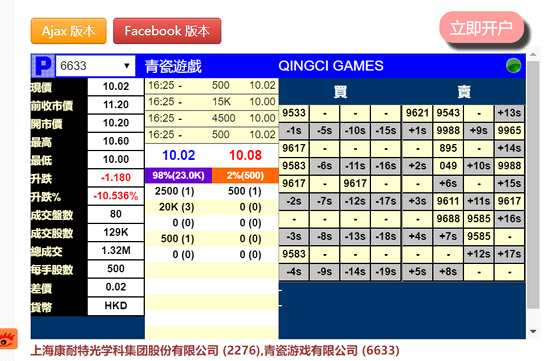 青瓷游戲(06633.HK)將于明日正式于港交所上市,今日暗盤跌10%,報(bào)10.02港元,發(fā)行價11.20港元/股,一手浮虧590港元。