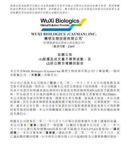 摘要: 12月16日消息,藥明生物港交所公告,公司已得悉公司股份于2021年12月15日出現(xiàn)股價及成交量不尋常波動。經(jīng)作出一切有關(guān)公司于合理情況下的查詢后,公司確認(rèn),其并不知悉任何根據(jù)香港法例第571章證券及