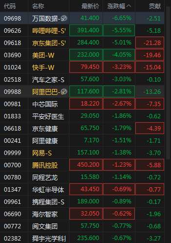 快訊:恒生科技指數(shù)跌近2% 萬(wàn)國(guó)數(shù)據(jù)跌近7%嗶哩嗶哩跌近6%