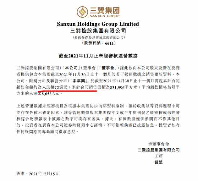 摘要: 12月16日訊:三巽控股集團有限公司(簡稱:三巽集團,6611.HK)發(fā)布截至2021年11月止未經(jīng)審核運營數(shù)據(jù)顯示,截至2021年11月30日止11個月,三巽集團實現(xiàn)累計合同銷售金額約為人民幣72億