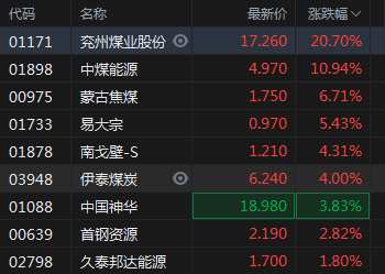 煤炭股集體走高 兗州煤業(yè)股份漲近21%中煤能源漲近11%