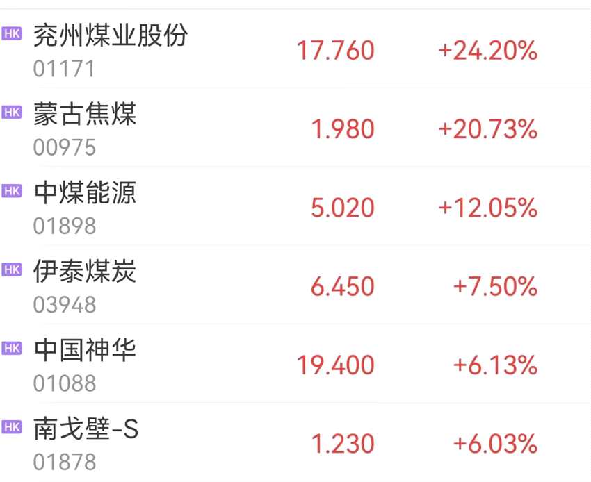 周四煤炭開采概念強勢拉升,其中兗州煤業(yè)股份(01171.HK)和蒙古焦煤(00975.HK),其分別上漲24.20%和20.73%。