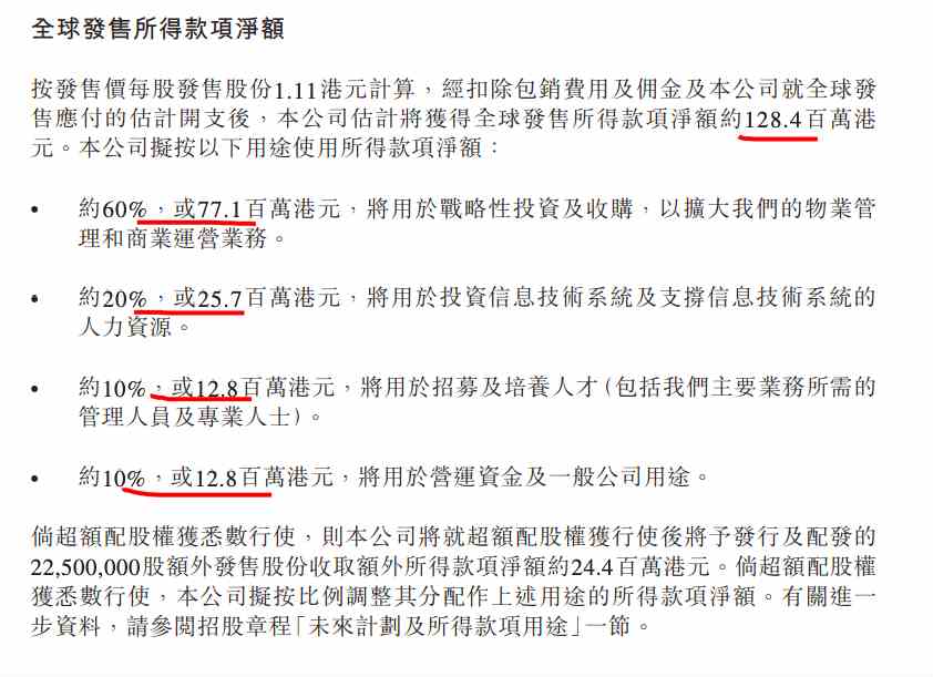 公告指出,募集資金的約60%即7710萬港元將用于戰(zhàn)略性投資及收購,以擴(kuò)大物業(yè)管理和商業(yè)運營業(yè)務(wù);約20%即2570萬港元將用于投資信息技術(shù)系統(tǒng)及支撐信息技術(shù)系統(tǒng)的人力資源;約10%即1280萬港元將用于招募及培養(yǎng)人才(包括主要業(yè)務(wù)所需的管理人員及專業(yè)人士);約10%即1280萬港元將用于營運資金及一般公司用途。