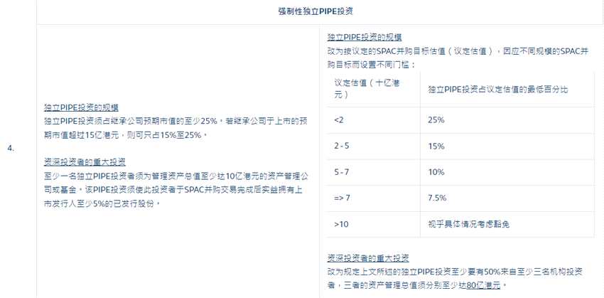 在專業(yè)投資者的重大投資方面,獨立PIPE投資至少要有50%來自至少三名機構(gòu)投資者,三者的資產(chǎn)管理總值須分別至少達80億港元。
