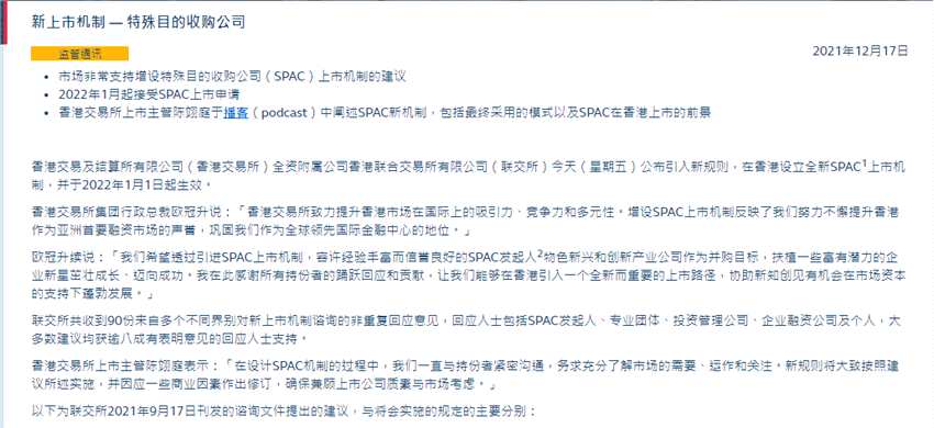 摘要: 財聯(lián)社(上海,編輯胡家榮)備受市場關(guān)注的特殊目的收購公司(SPAC)上市機制正式落地。香港交易所(00388.HK)周五盤后宣布SPAC上市機制明年1月1日正式實行。