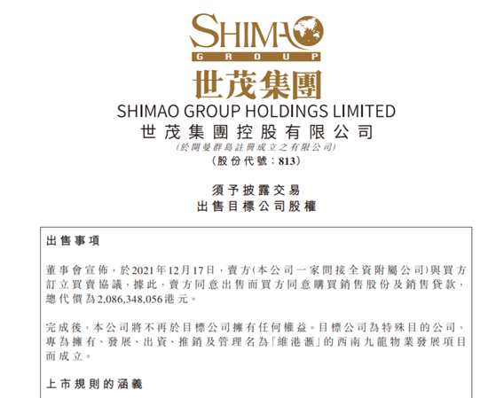 摘要: 世茂集團(tuán)港交所公告,于12月17日,賣方(本公司一家間接全資附屬公司)與買方訂立買賣協(xié)議,據(jù)此,賣方同意出售而買方同意購(gòu)買銷售股份及銷售貸款,總代價(jià)為2,086,348,056港元。