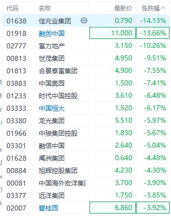 12月20日消息,港股內房股走低,佳兆業(yè)集團跌超14%,融創(chuàng)中國跌近14%,富力地產跌超10%,世茂集團跌9.51%,合景泰富集團跌7.55%,中國奧園跌超7%,時代中國控股、中國恒大跌超6%,融信中國跌超5%,禹州集團跌超4%。